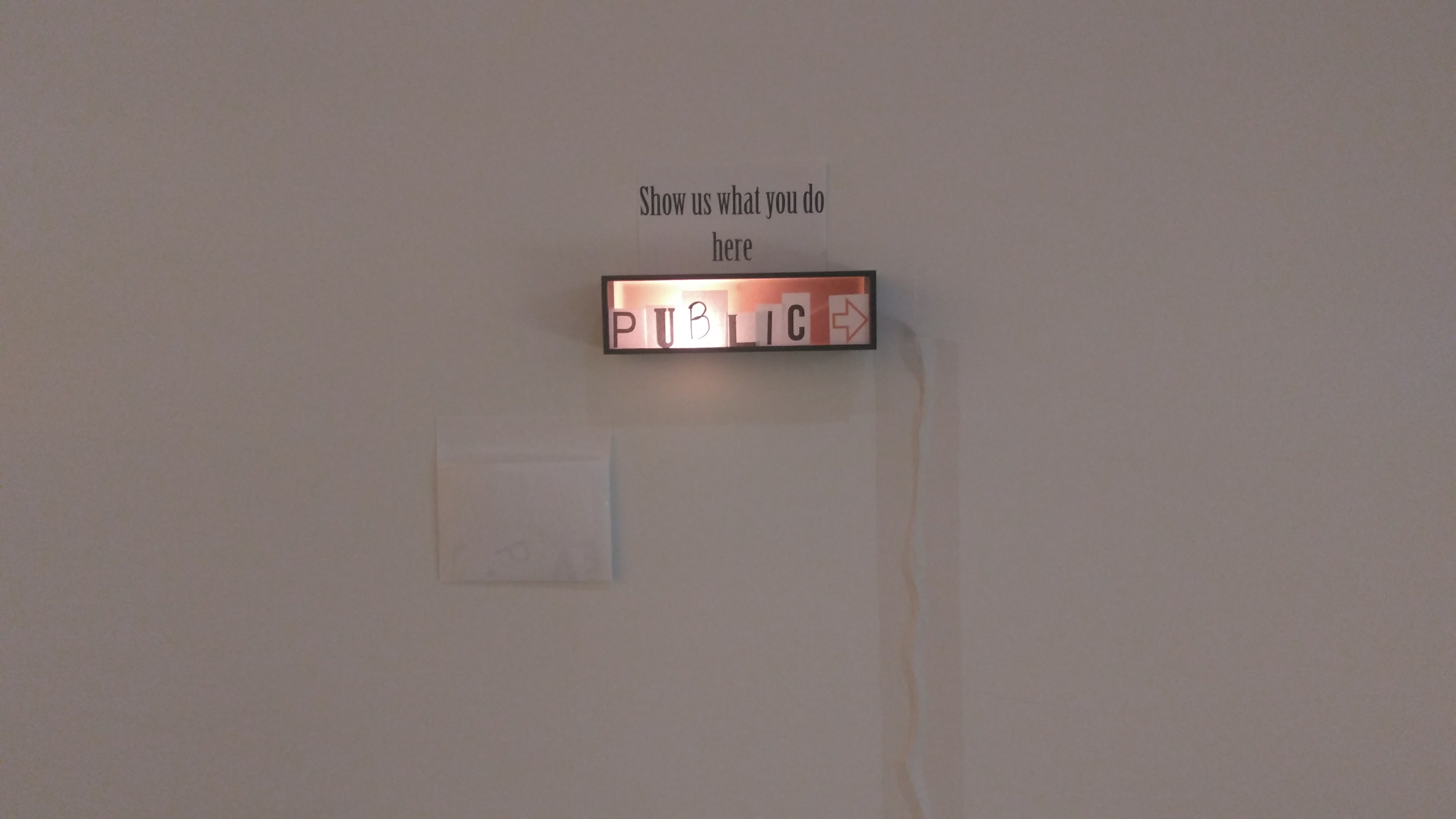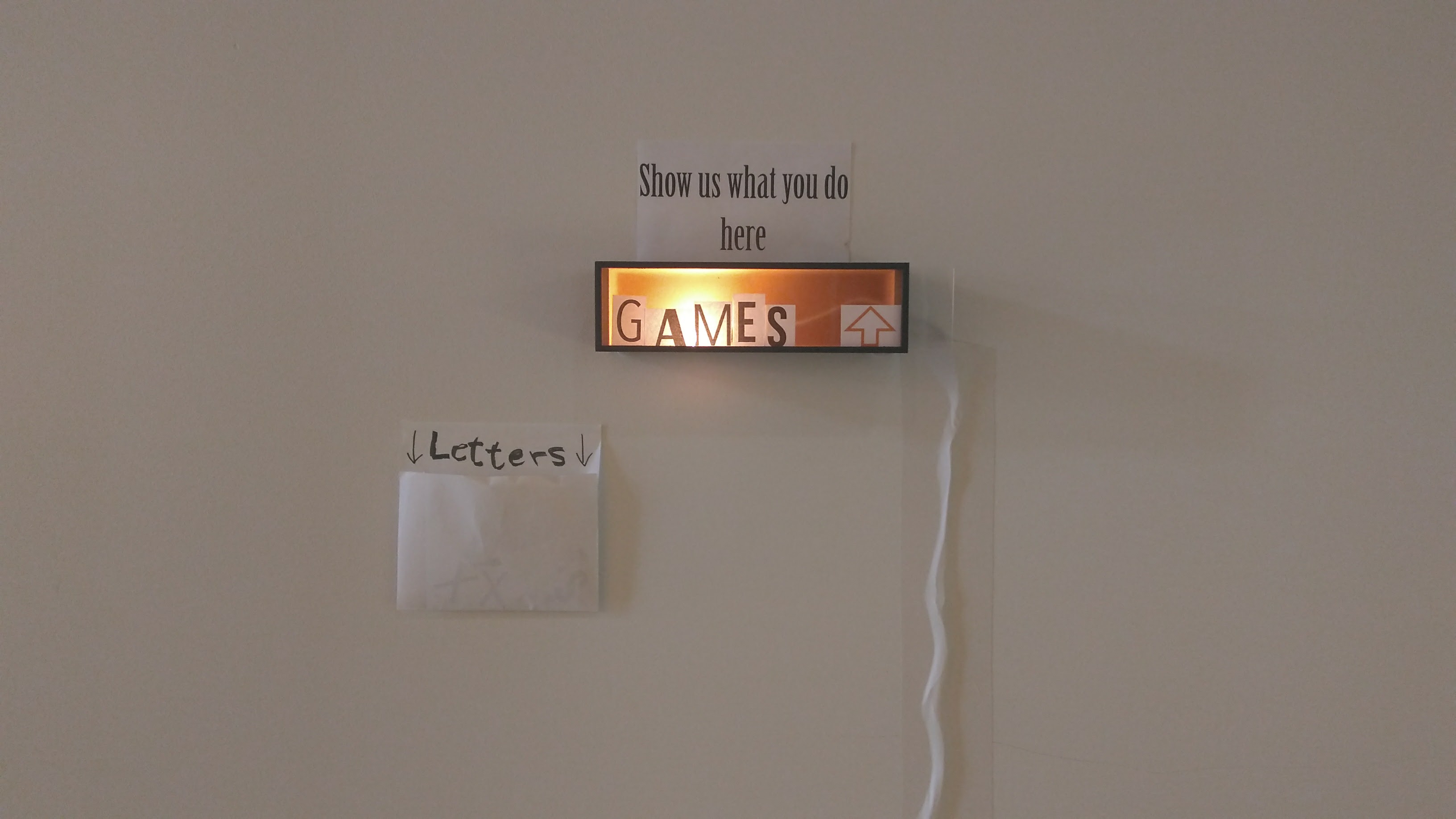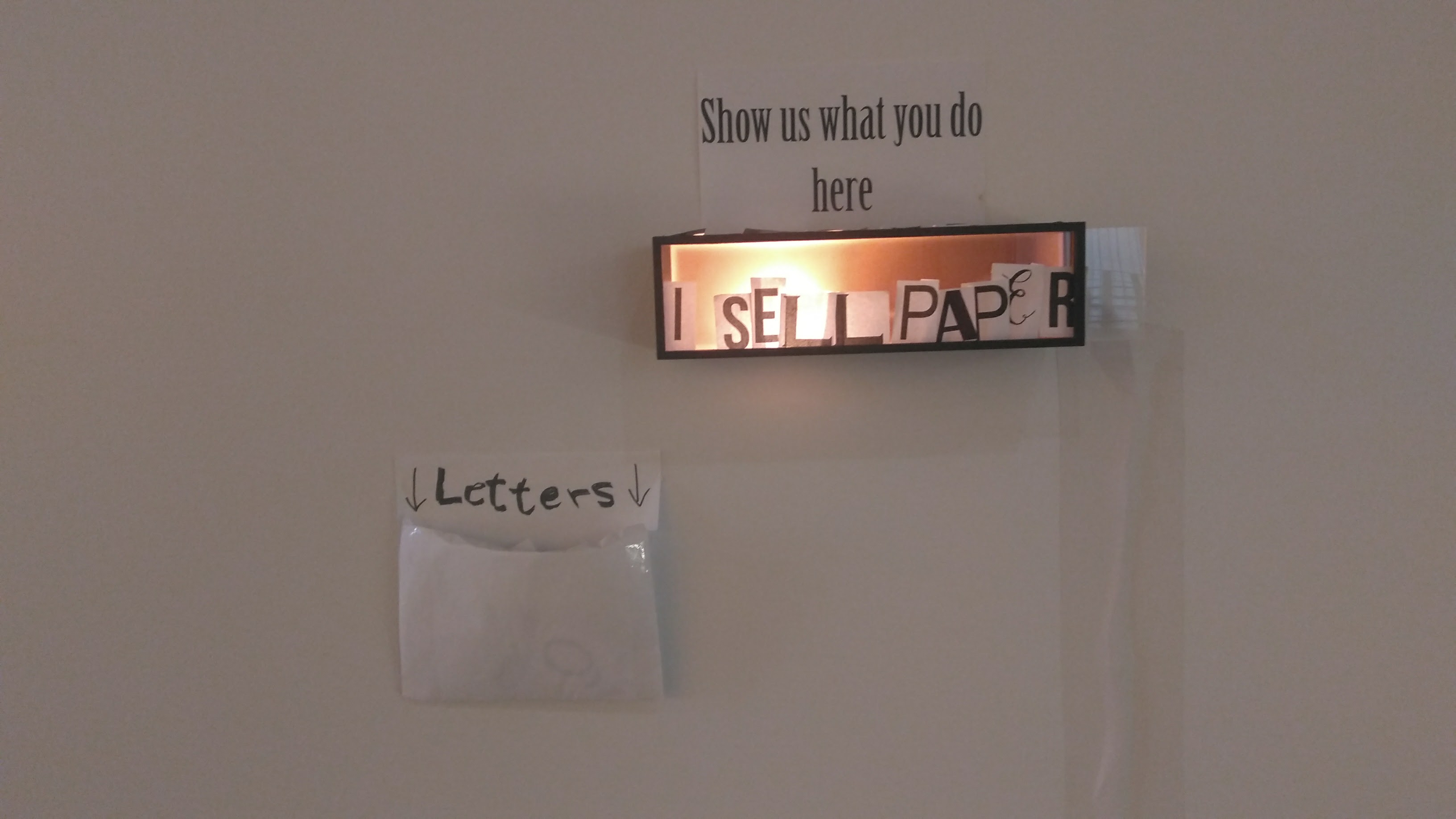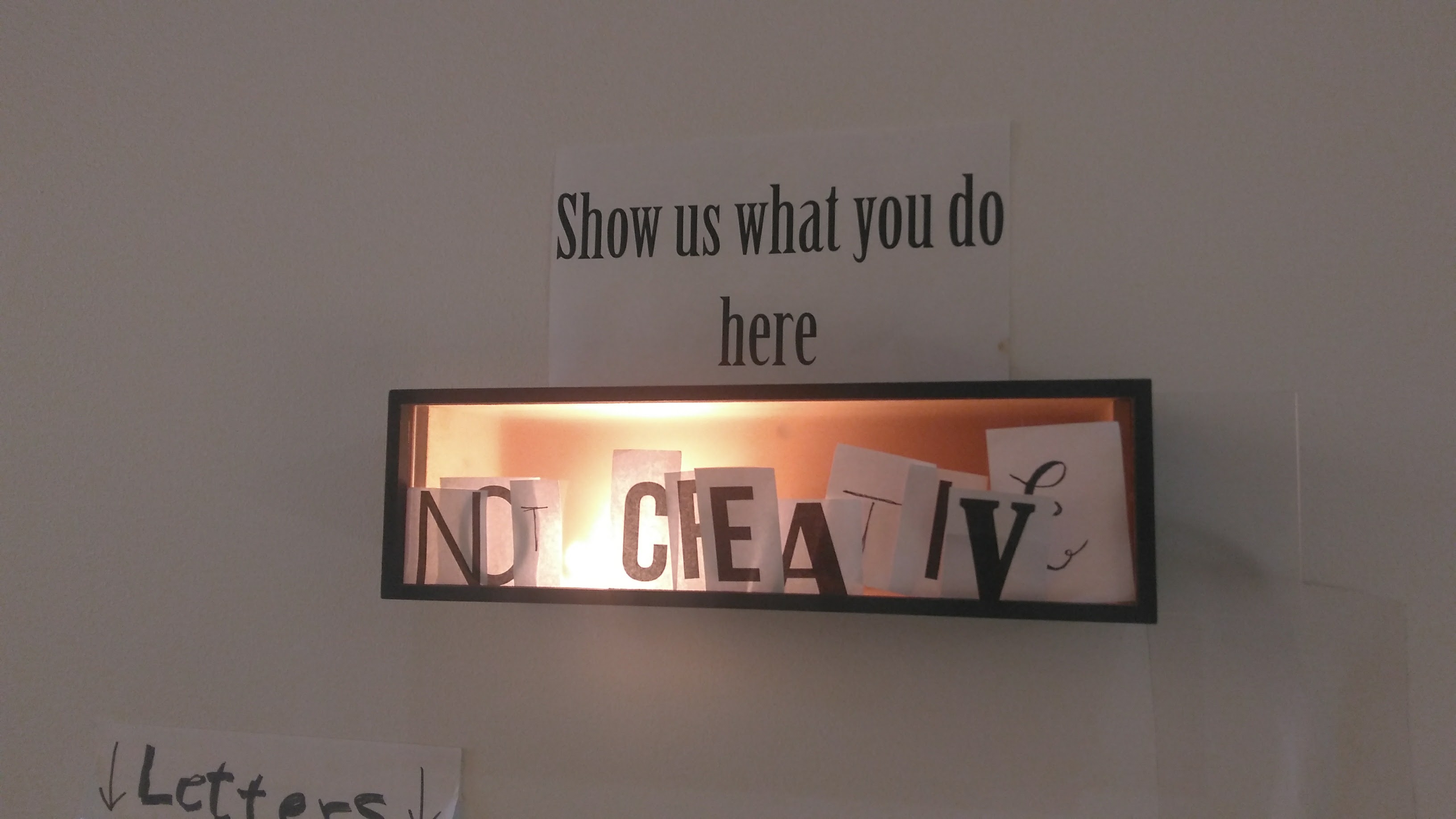 What: interactive analog installation which consists of a wood box with a lamp inside, a sign written “show us what you do here” and an envelop with cut out letter in different fonts.
