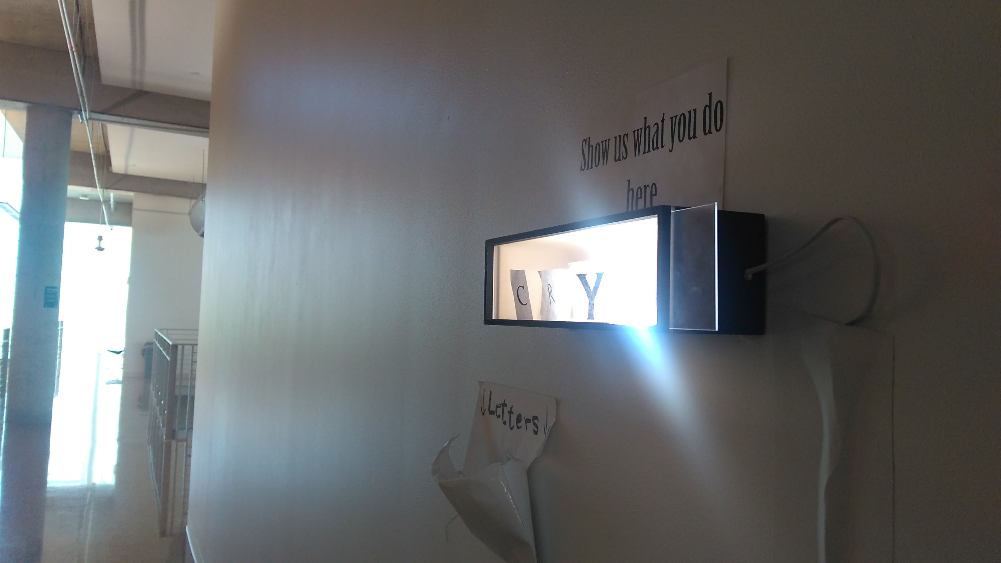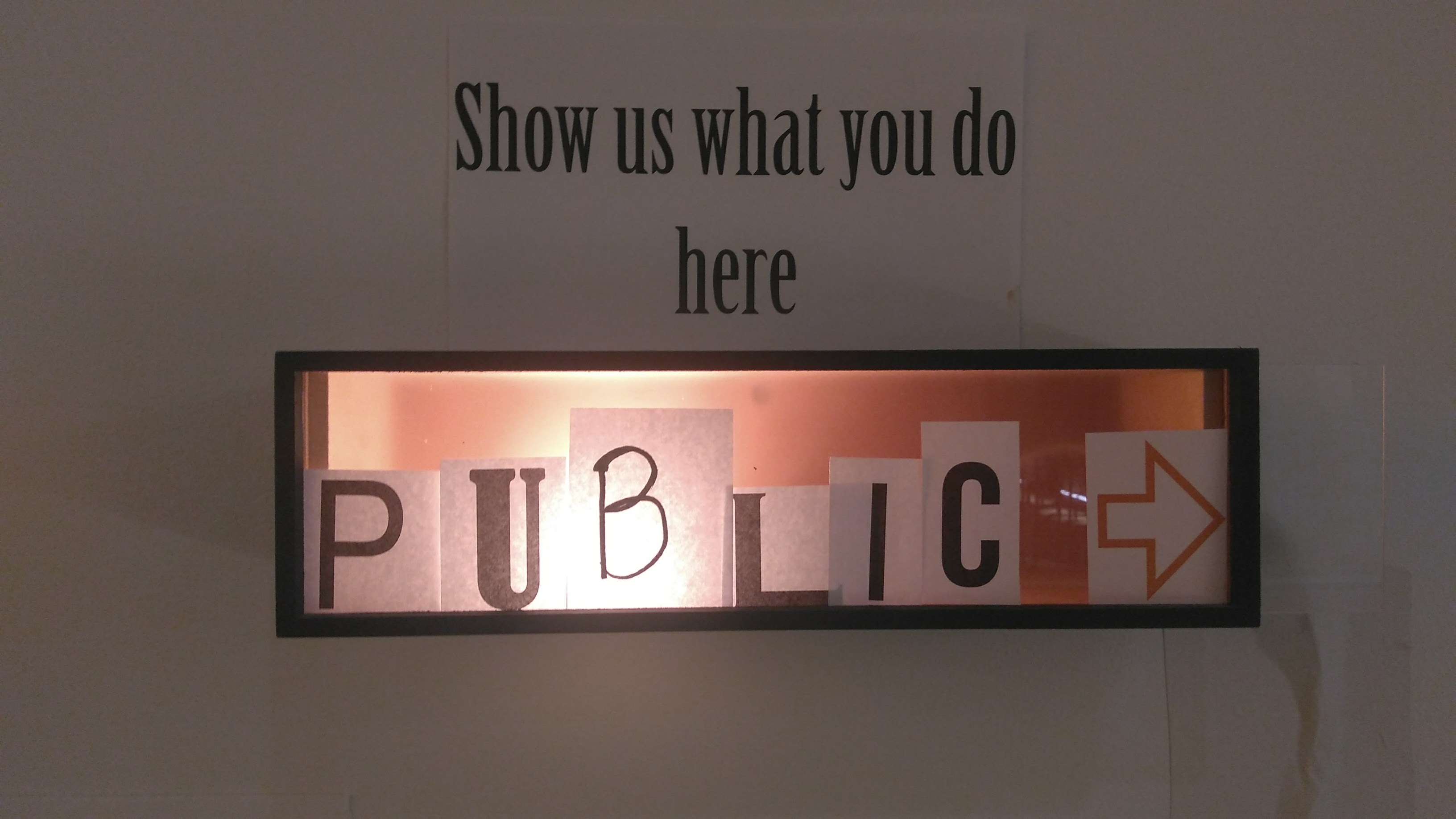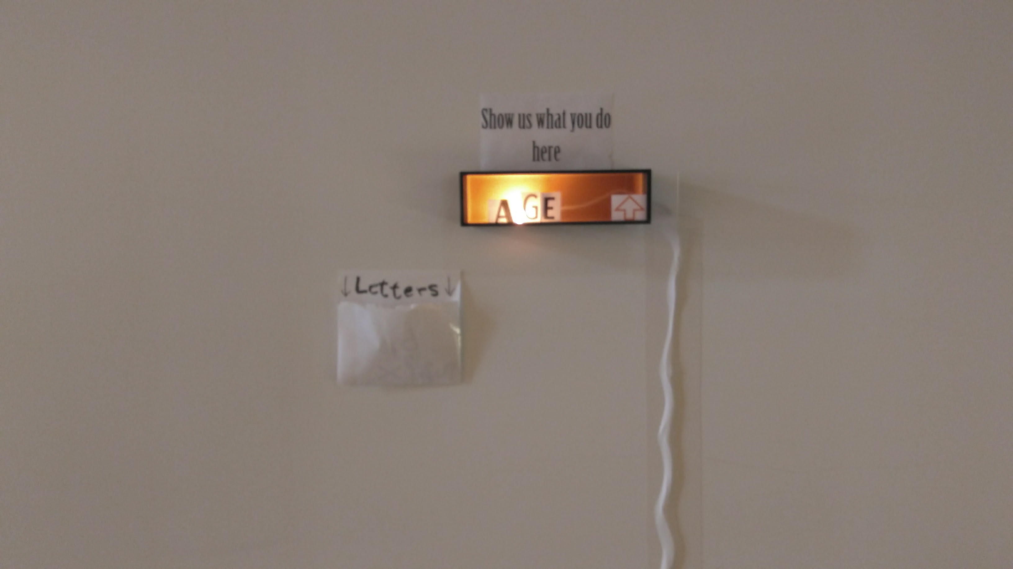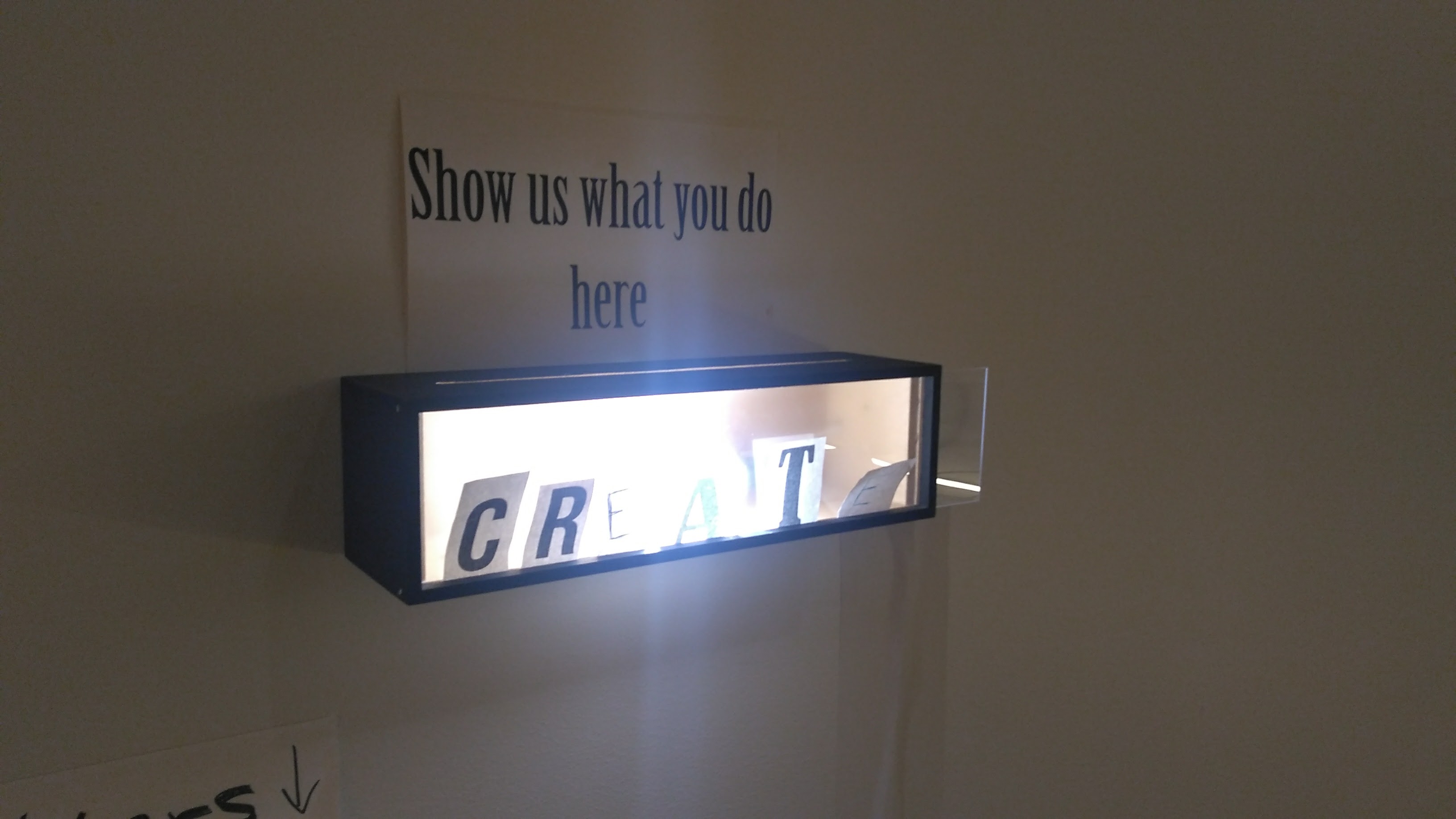 What: interactive analog installation which consists of a wood box with a lamp inside, a sign written “show us what you do here” and an envelop with cut out letter in different fonts.