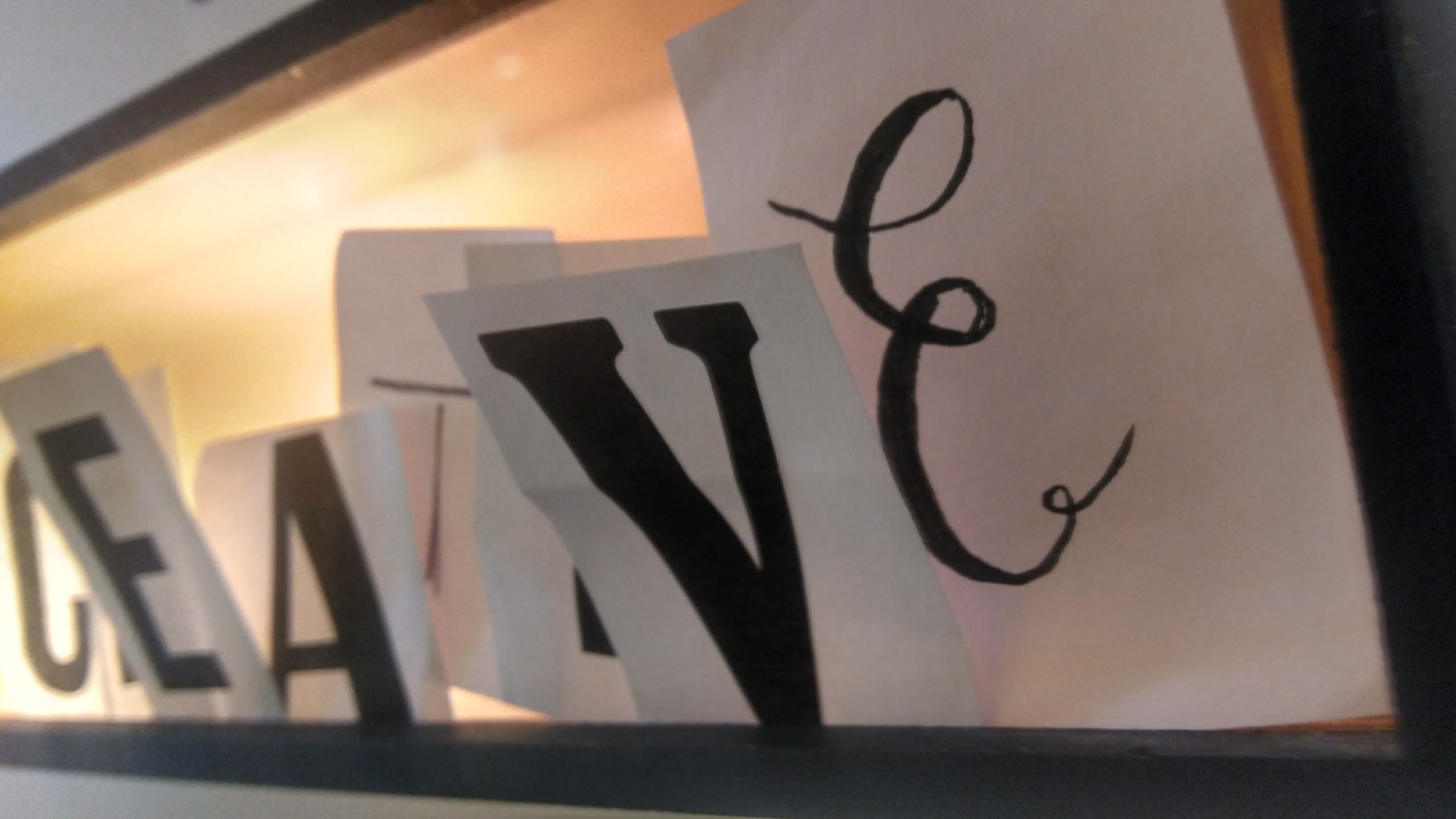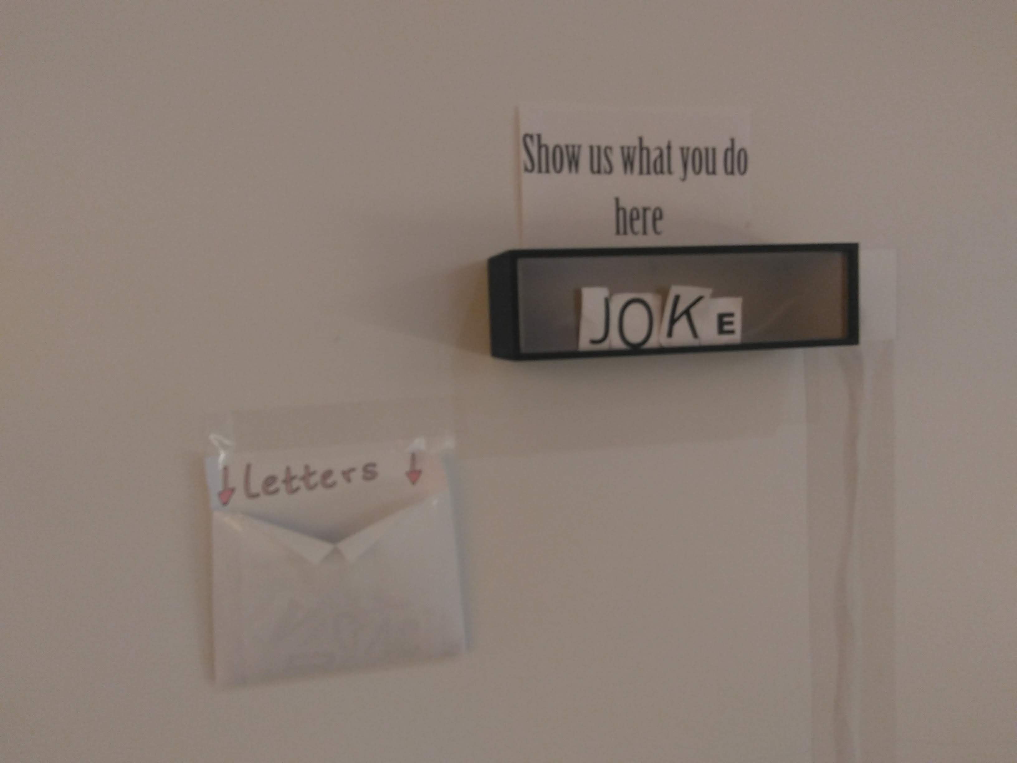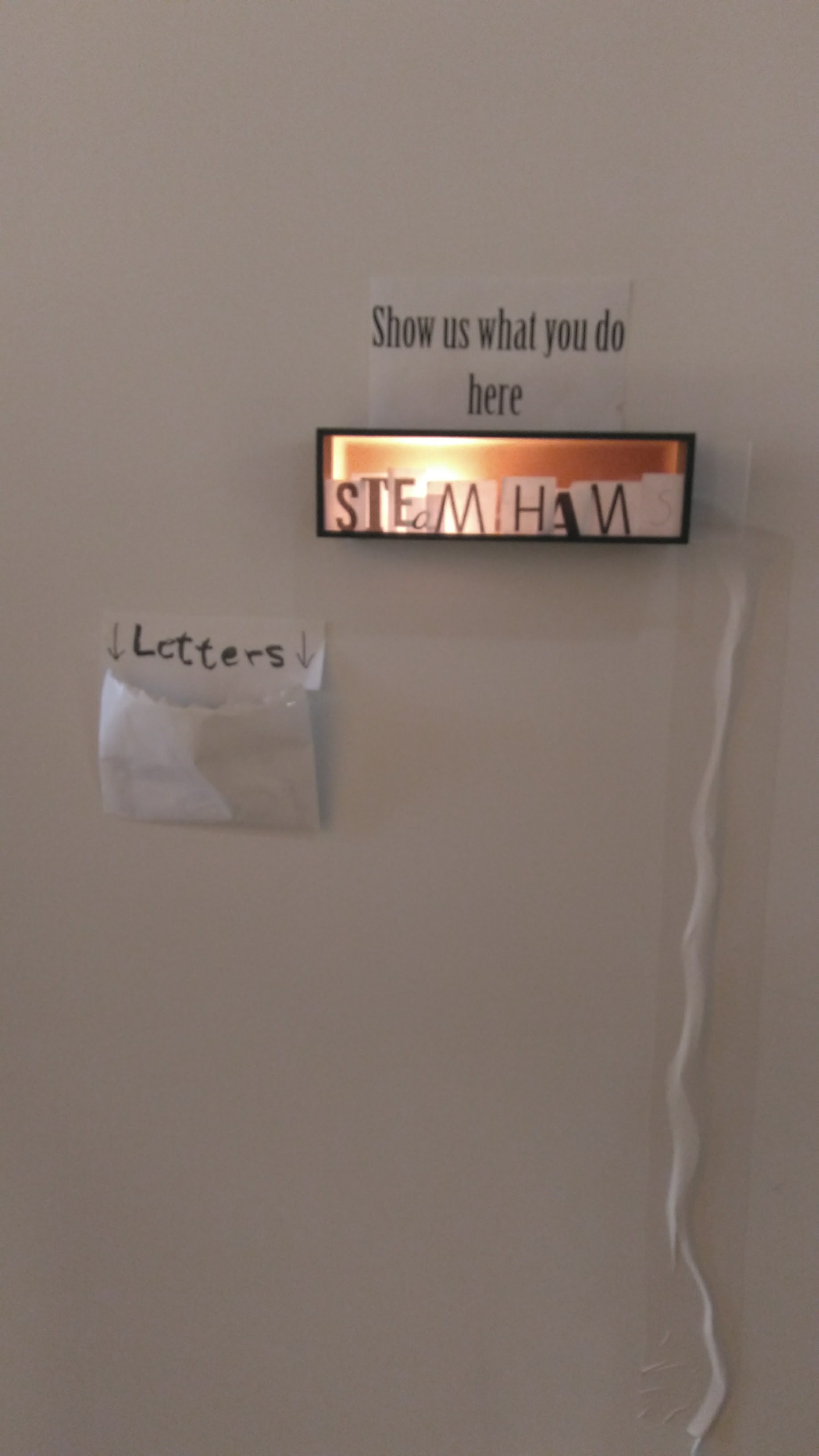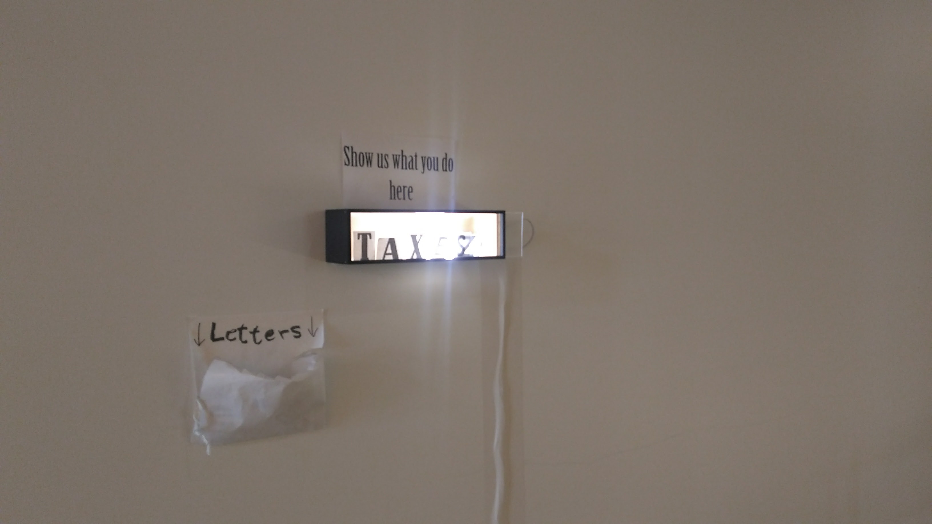What: interactive analog installation which consists of a wood box with a lamp inside, a sign written “show us what you do here” and an envelop with cut out letter in different fonts.