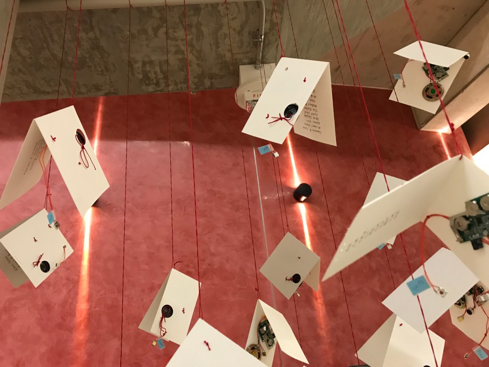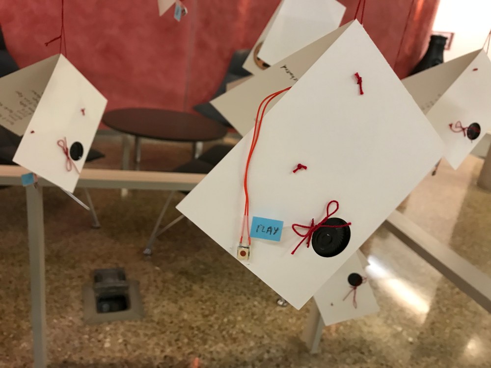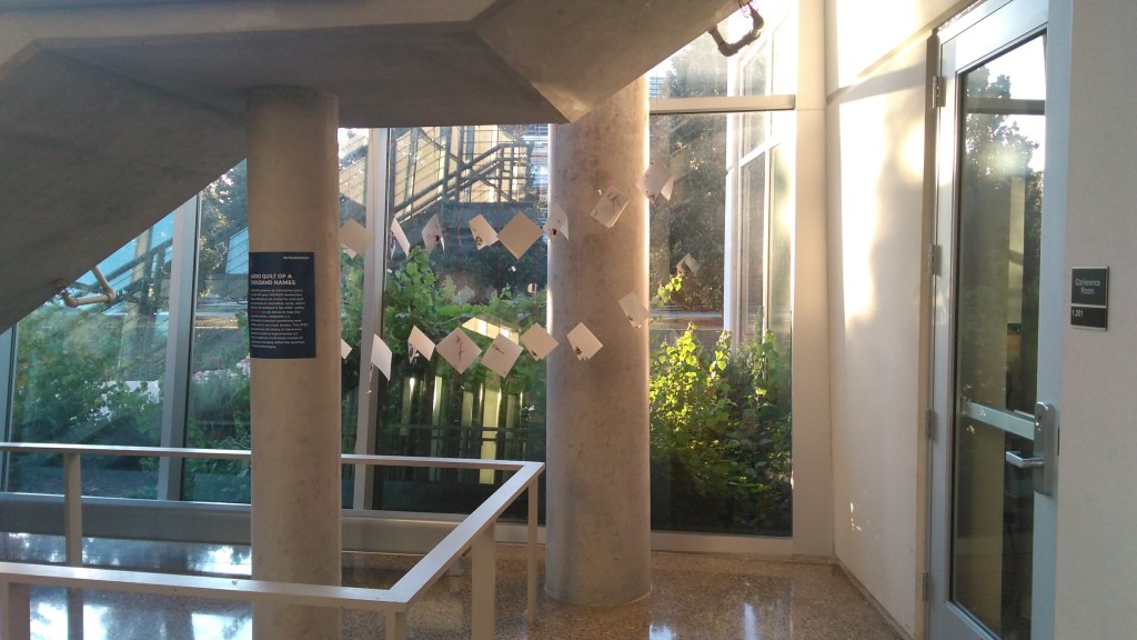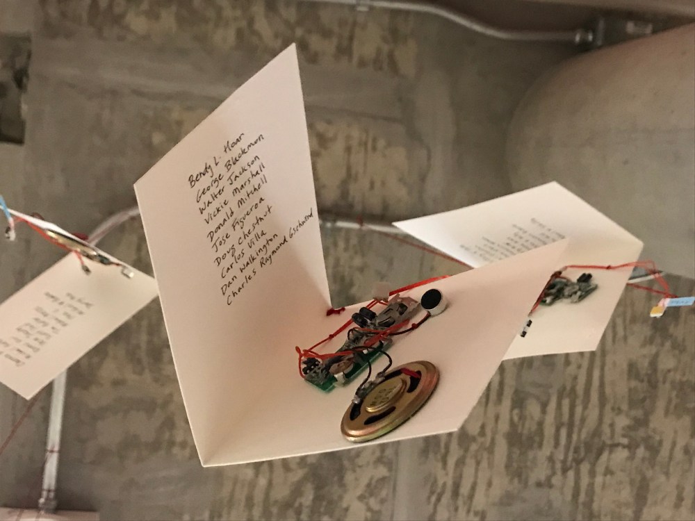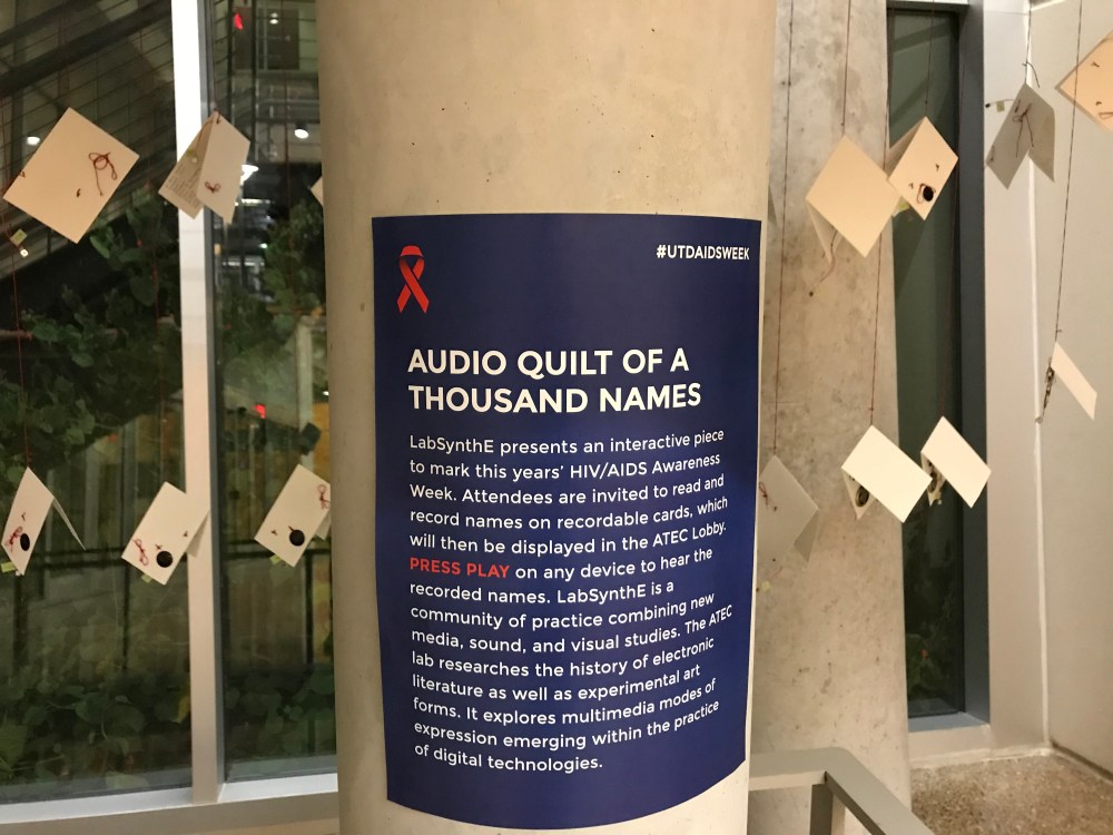 We cut white paper in square-ish cards, sewed a small recording device with speakers with red thread, wrote ten names of people memorialized on the Quilt, and sewed them shut. During the HIV/AIDS Week, we offered 20 cards per day, for five days. We invited people to take a card, go to a quieter place, record the ten names written on the card, and give the card back to us. After each day, we would hang cards in different spaces on the ATEC lobby, creating a live sculpture that changed daily.