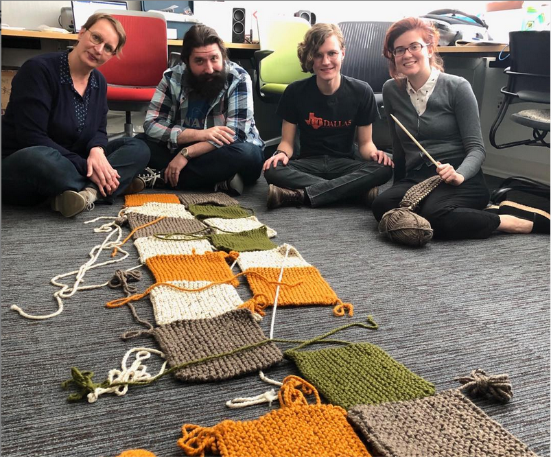 We used one shawl that Dr. Sabrina Starnaman had made before (the purple, blue and green), and collectively knitted a new one (the cream and yellow one).