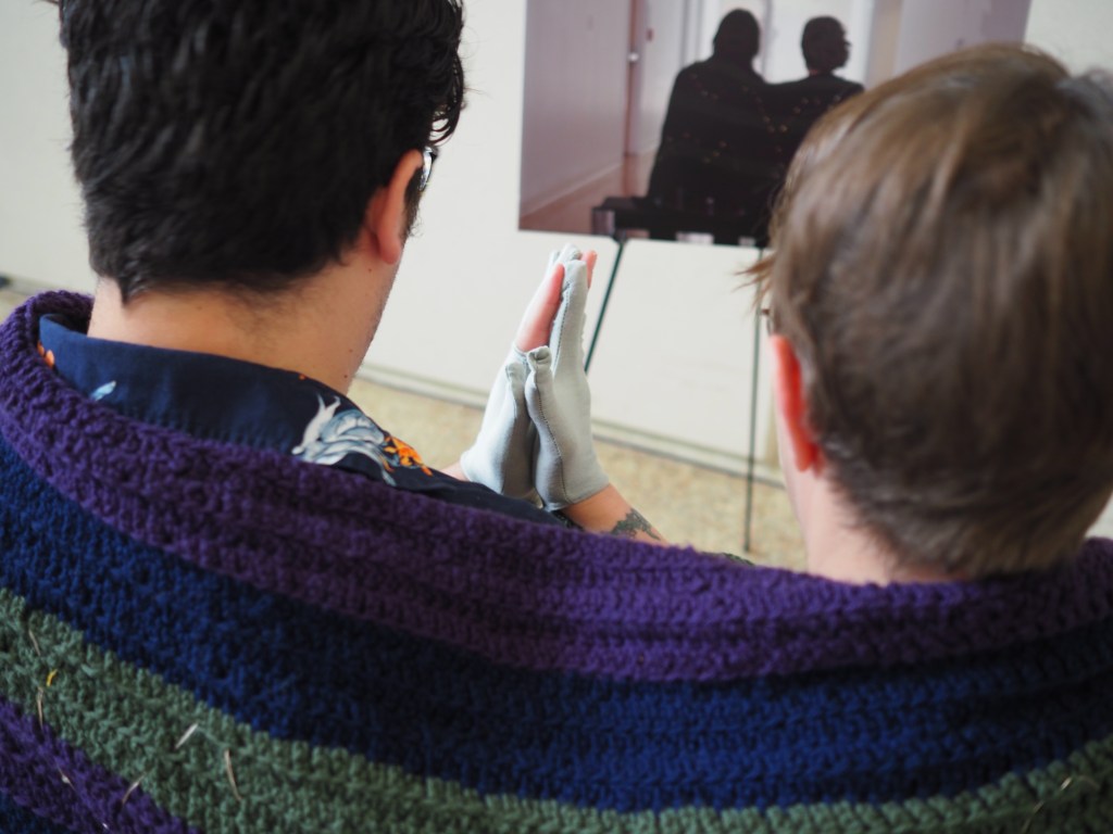 Two participants sit together under the blanket, wear gloves and touch palms. The glove on one person senses the body of the other, triggering lights woven in the blanket that blink on the rhythm of their pair’s heart beat.