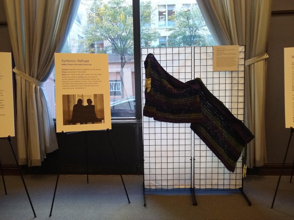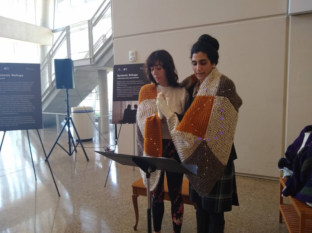 Syntonic Refuge is a social engagement that explores the importance of refuge for survivors and the act of surviving. We find refuge in our community of individuals. People are syntonic, harmoniously responsive to the changing needs of the situation. Through close human interaction, Syntonic Refuge makes visible the heartbeats of two people who wrap themselves in the embrace of a handmade shawl. The shawl represents both care of the individual, and a shelter for shared experience.